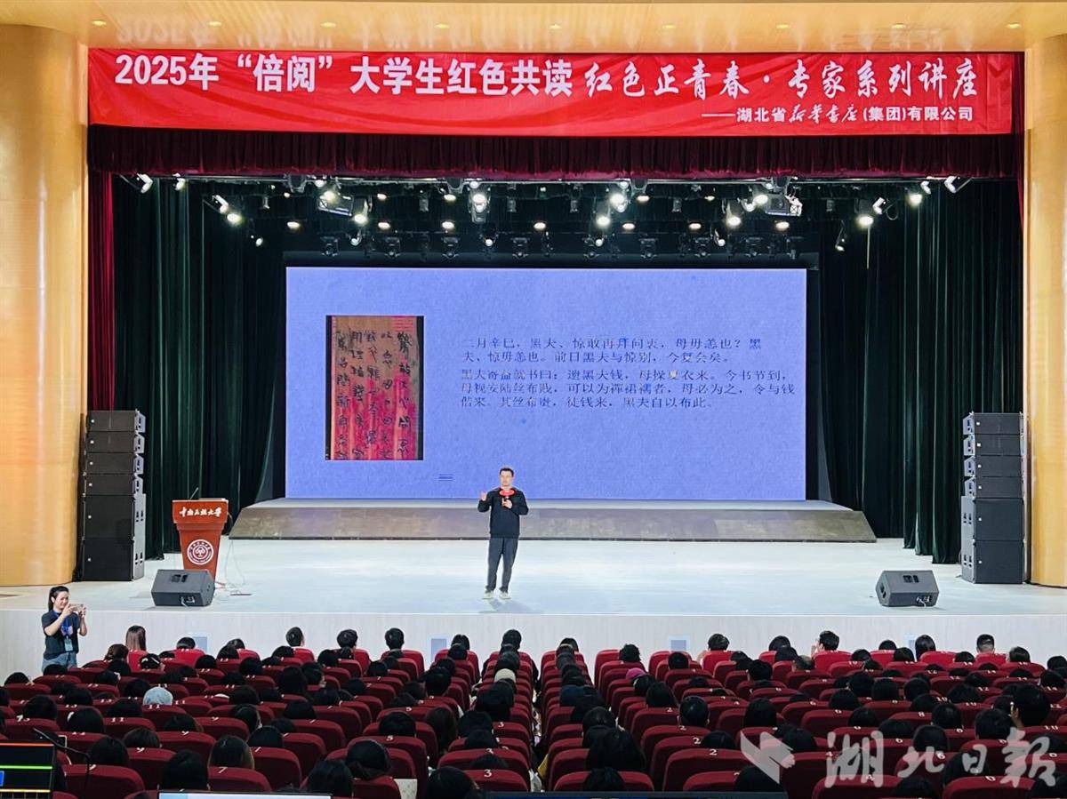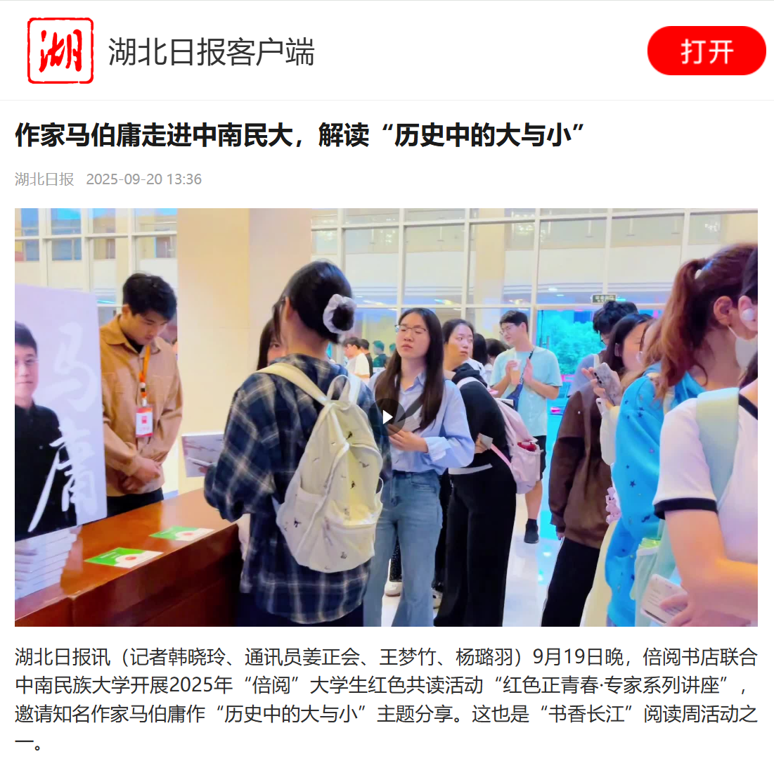 9月19日晚,倍閱書店聯(lián)合中南民族大學(xué)開展2025年“倍閱”大學(xué)生紅色共讀活動“紅色正青春·專家系列講座”,邀請知名作家馬伯庸作“歷史中的大與小”主題分享。這也是“書香長江”閱讀周活動之一。