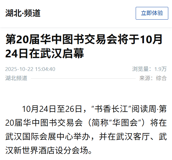 10月24日至26日,“書香長江”閱讀周·第20屆華中圖書交易會(huì)(簡稱“華圖會(huì)”)將在武漢國際會(huì)展中心舉辦,并在武漢客廳、武漢新世界酒店設(shè)分會(huì)場。