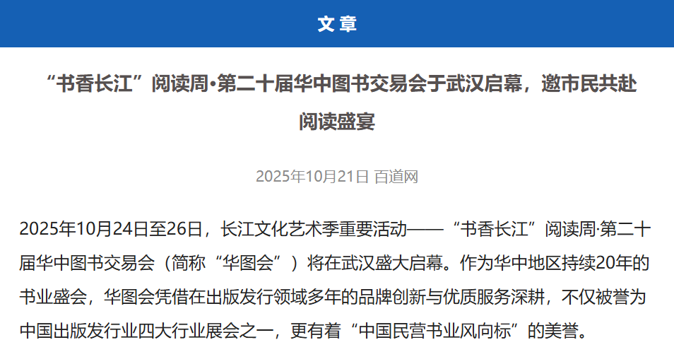 2025年10月24日至26日,長江文化藝術(shù)季重要活動——“書香長江”閱讀周·第二十屆華中圖書交易會(簡稱“華圖會”)將在武漢盛大啟幕。作為華中地區(qū)持續(xù)20年的書業(yè)盛會,華圖會憑借在出版發(fā)行領(lǐng)域多年的品牌創(chuàng)新與優(yōu)質(zhì)服務(wù)深耕,不僅被譽為中國出版發(fā)行業(yè)四大行業(yè)展會之一,更有著“中國民營書業(yè)風(fēng)向標(biāo)”的美譽。