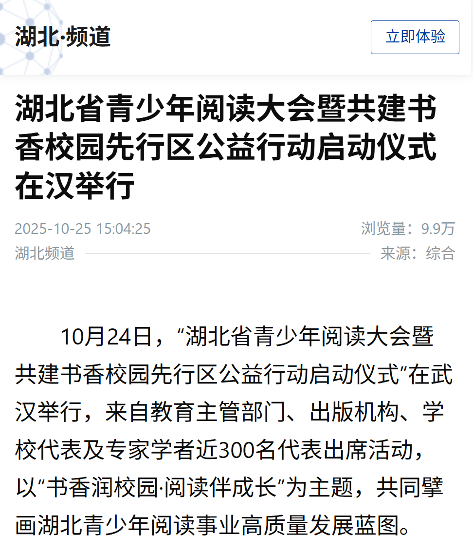 10月24日,“湖北省青少年閱讀大會暨共建書香校園先行區(qū)公益行動啟動儀式”在武漢舉行,來自教育主管部門、出版機構、學校代表及專家學者近300名代表出席活動,以“書香潤校園·閱讀伴成長”為主題,共同擘畫湖北青少年閱讀事業(yè)高質量發(fā)展藍圖。