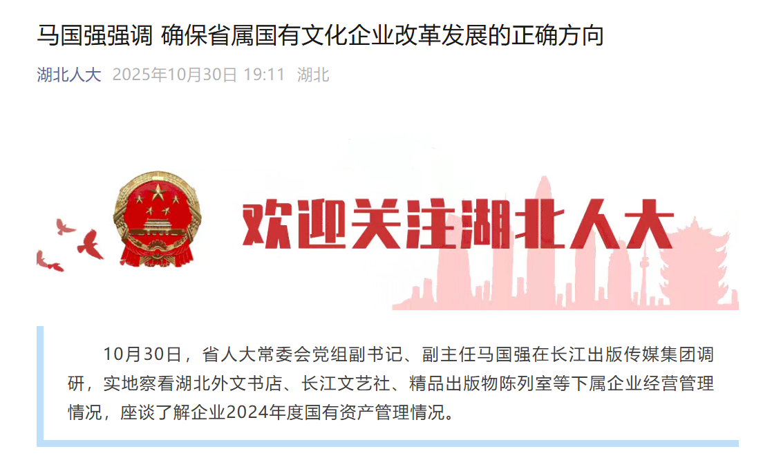 10月30日,省人大常委會黨組副書記、副主任馬國強在長江出版?zhèn)髅郊瘓F調(diào)研,實地察看湖北外文書店、長江文藝社、精品出版物陳列室等下屬企業(yè)經(jīng)營管理情況,座談了解企業(yè)2024年度國有資產(chǎn)管理情況。