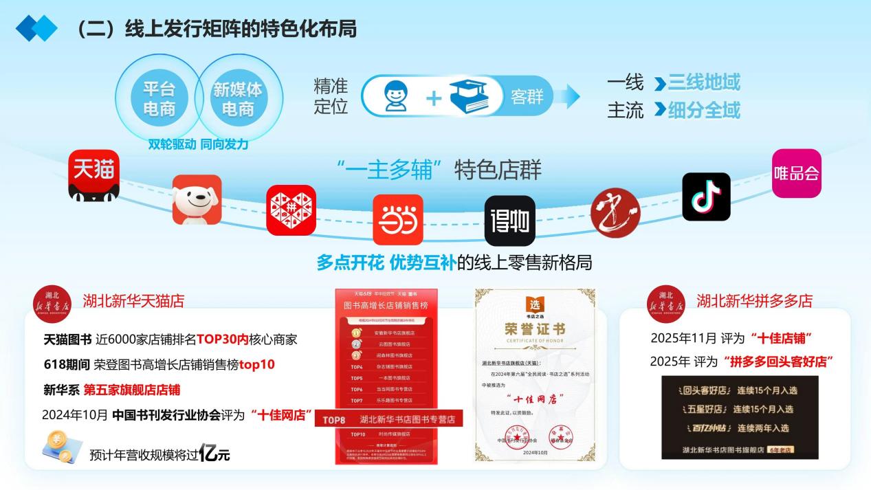 在渠道建設方面,堅持“平臺電商與新媒體電商雙輪驅動、同向發(fā)力”的戰(zhàn)略,結合新華書店的供應鏈優(yōu)勢,精準定位兒童與教育兩大核心客群,建設覆蓋一線至三線地域、主流至細分全域的營銷鏈路。建立天貓、京東、拼多多“一主多輔”的特色店群體系,形成多點開花、優(yōu)勢互補的線上零售新格局。創(chuàng)新性構建官方號、童書號、文教號“主次協(xié)同”的抖音賬號矩陣,重點打造了湖北新華“庫房嚴選”及“倍悅薦讀”兩大直播IP。