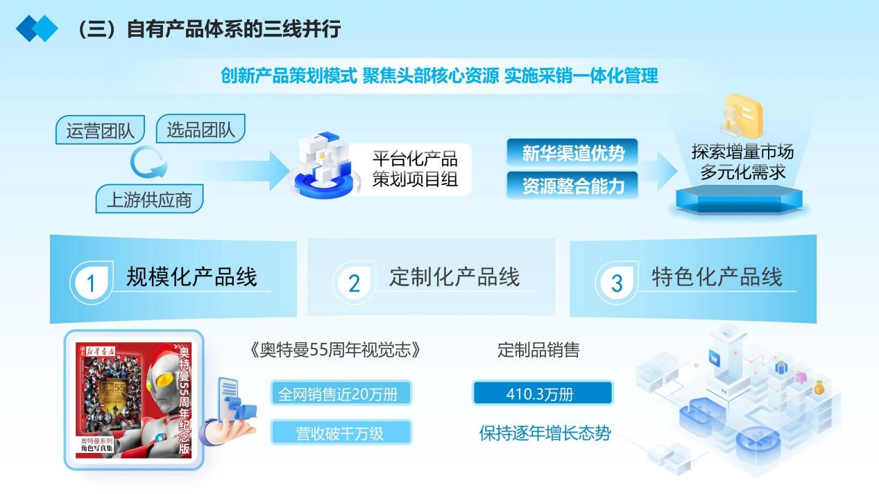 在產品建設方面,我們創(chuàng)新產品策劃模式,聚焦頭部核心資源,實施采銷一體化管理。充分結合新華渠道優(yōu)勢,通過豐富產品業(yè)態(tài)、強化定制營銷,建設起湖北新華電商“規(guī)?;薄岸ㄖ苹薄疤厣比龡l產品線。2022年,我們打造的《奧特曼55周年視覺志》實現(xiàn)全網銷售近20萬冊,營收突破千萬元大關。截至2025年9月,湖北新華電商定制品銷售已達410.3萬冊,并保持逐年增長的良好態(tài)勢。