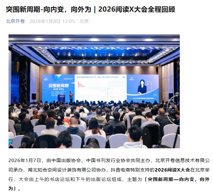2026年1月7日,由中國出版協(xié)會、中國書刊發(fā)行業(yè)協(xié)會共同主辦,北京開卷信息技術(shù)有限公司承辦,湖北知合空間設(shè)計裝飾有限公司協(xié)辦,抖音電商特別支持的2026閱讀X大會在北京舉行,大會由上午的書店論壇和下午的出版論壇組成,主題為「突圍新周期—向內(nèi)變,向外為」。