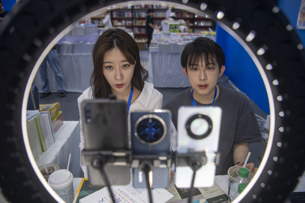 9月27日,工作人員在“書香長江”閱讀周·武漢書展上直播售書。新華社記者 伍志尊 攝